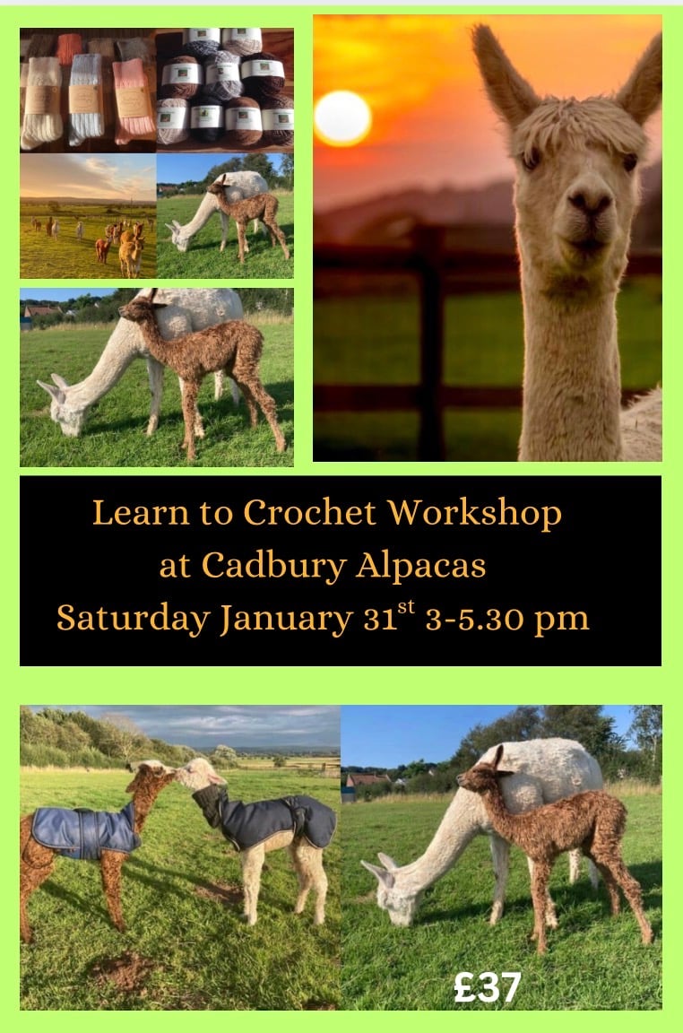 This workshop is held by Naomi, and is aimed at complete beginners . Cadbury alpaca owner, Charlotte Brockwell, will start the workshop with a short talk on the farm, her vision, Alpaca husbandry, and fleece to yarn production. Afterwards, at 3.30 pm, Naomi will teach her hugely popular “learn to crochet workshop” in the round house outside next to the Alpaca field. Students will learn how to make a chain and then the basic stitches . The alpaca herd will be in the field next to the workshop so you can even go to see them over the fence to say hello. There are Cria too at the moment! (baby alpaca) .